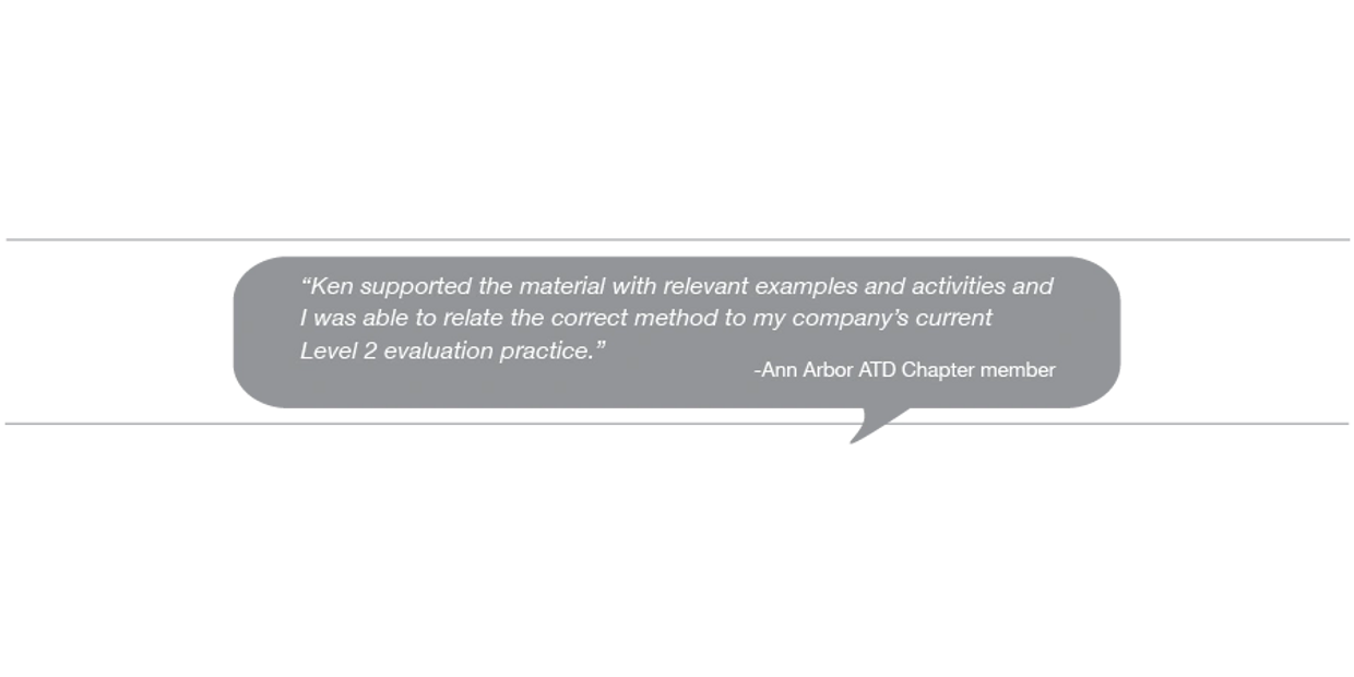 Bring this informative, highly engaging session in-house to your L&D team. Provide them with practical tips and guidelines on how to write Level 2 quiz and test questions that produce valued data. Particular emphasis is also given to writing test questions that measure job application and not the mere recall of facts.